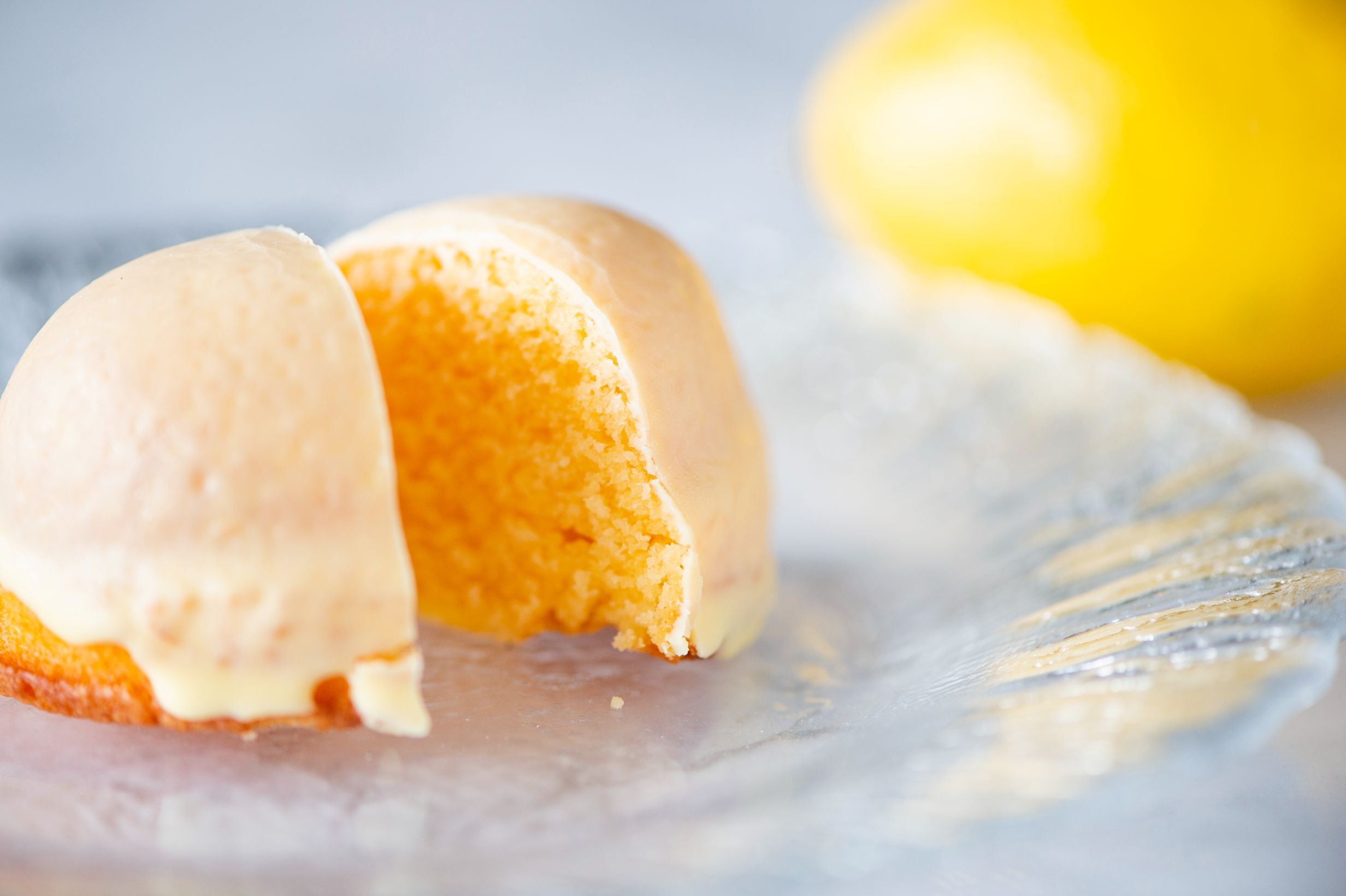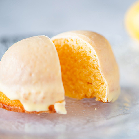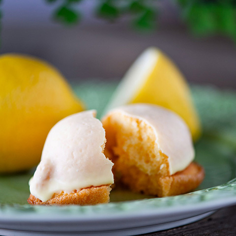 ケーキ生地をほんのりレモン風味のチョコレートでコーティング。冷蔵庫で少し冷やすとパリッとした食感に。